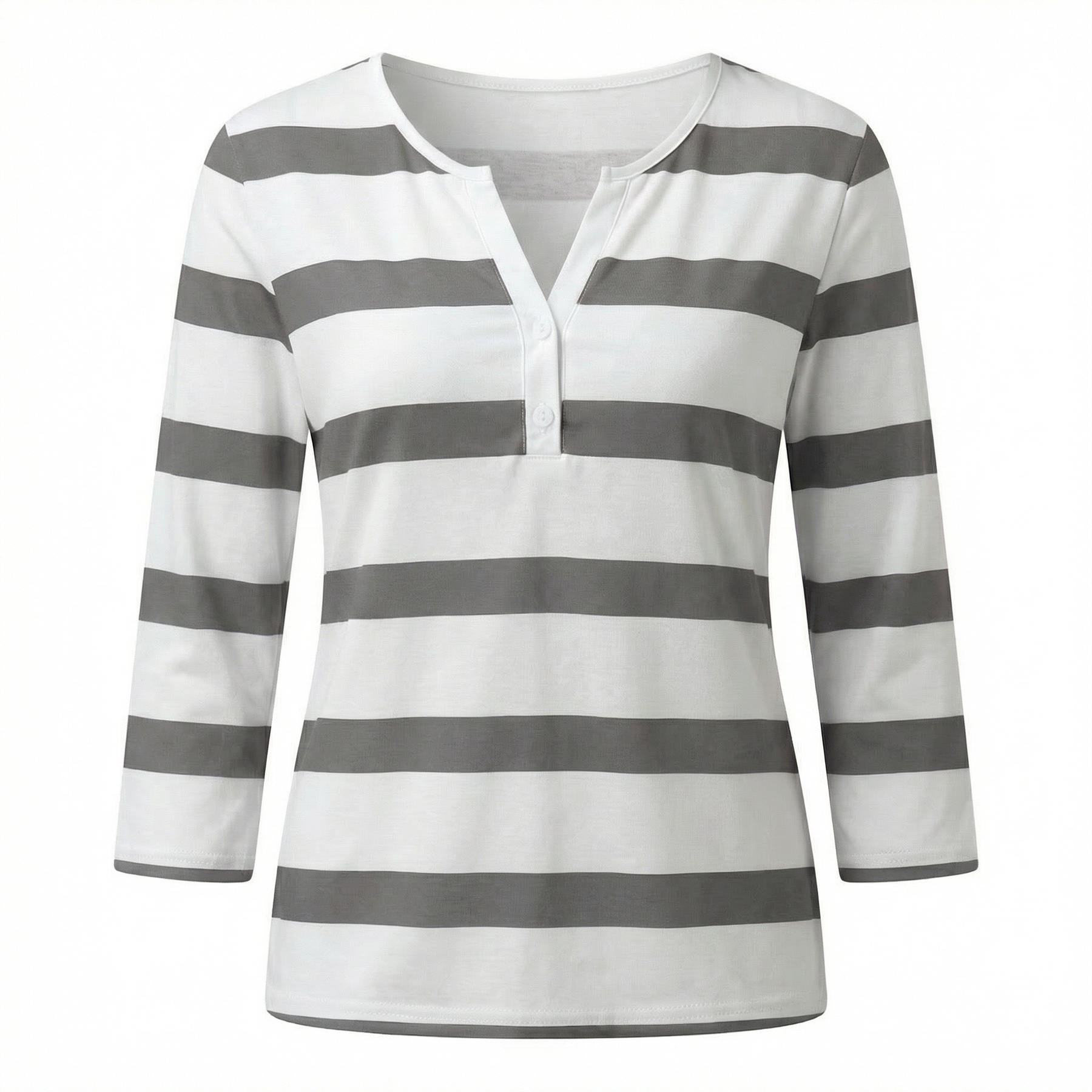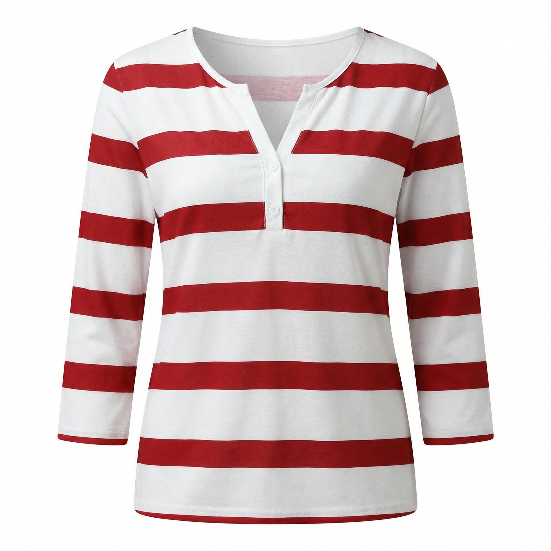 Casual, cheerful and easy to wear, this striped V-neck top brings a relaxed nautical spirit to warm-weather dressing. Bold horizontal stripes paired with a button-placket V-neckline give it a playful yet put-together feel, while the three-quarter sleeves add a touch of effortless style. A natural pairing with your favourite jeans or linen shorts for a breezy, laid-back summer look.